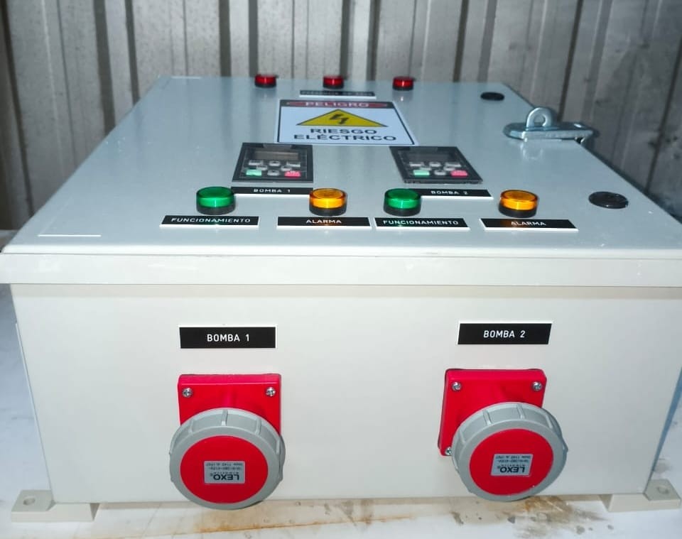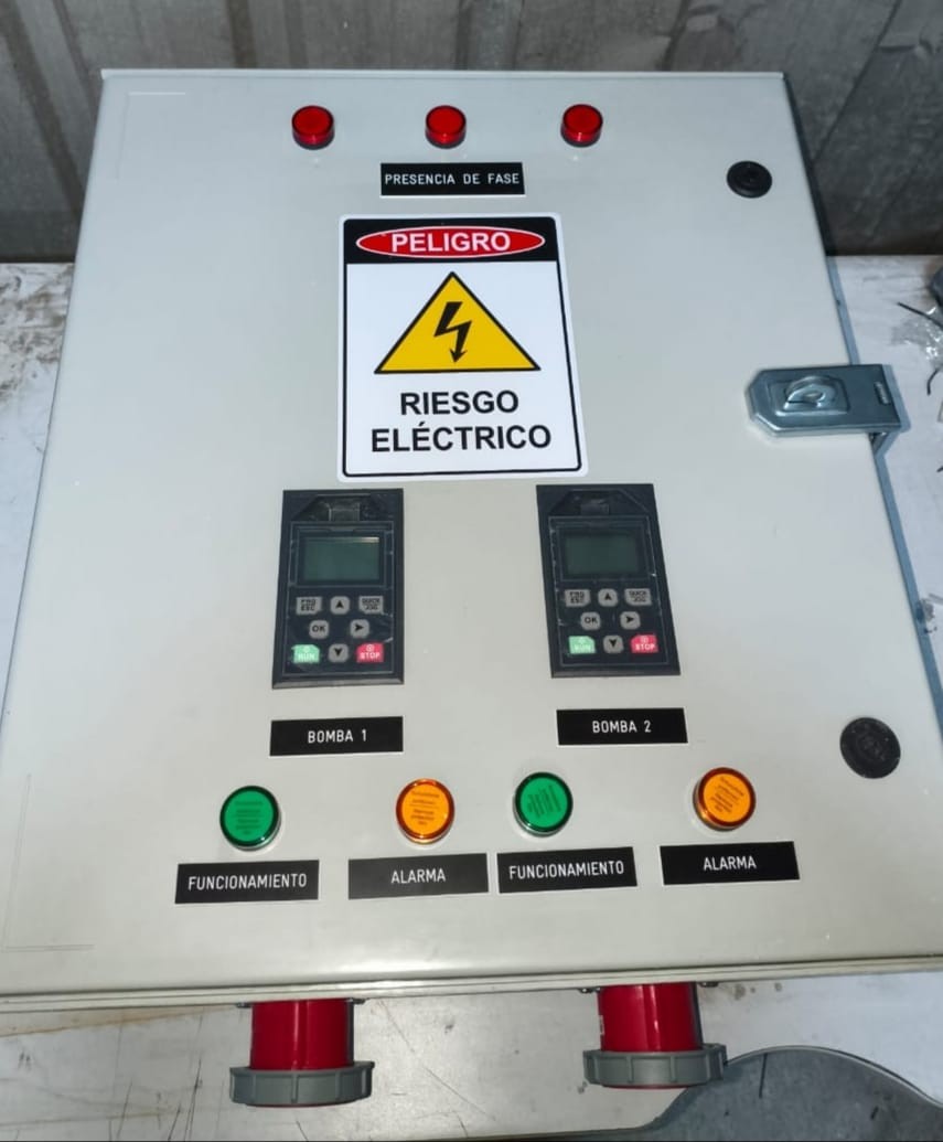 Armado de tablero eléctrico con variadores de frecuencia para controlar el funcionamiento de bombas, integrando sistemas de control, señalización y protección para una operación segura, además de incluir conectores externos que facilitan la conexión, mantenimiento y maniobra de los motores.